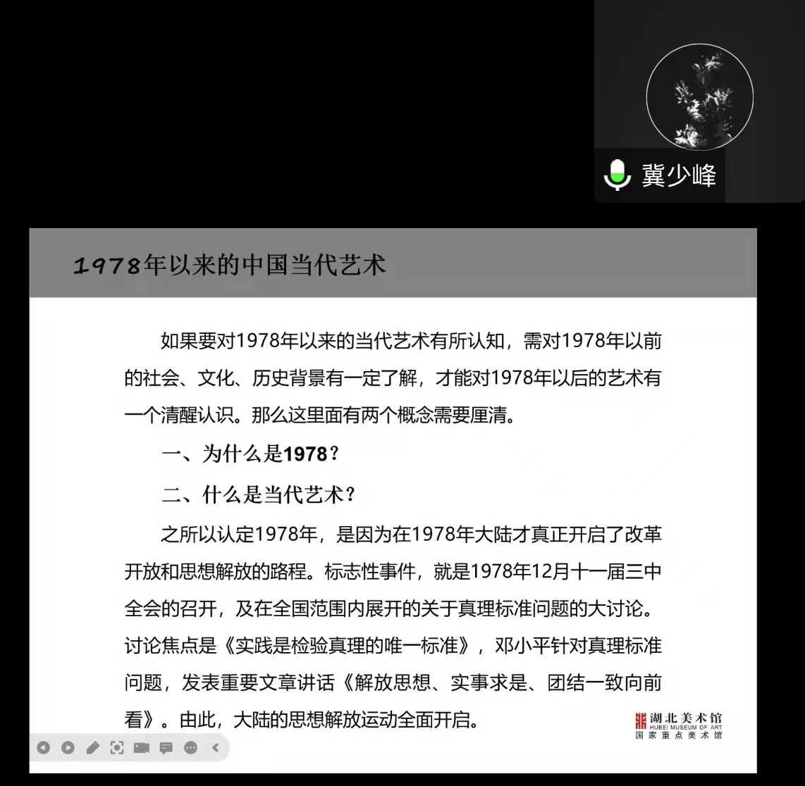 11月24日下午,湖北美术馆馆长冀少峰应我院邀请,在线做了题为“1978年以来的中国当代艺术”的学术讲座,讲座由我院院长聂书法主持,近300余名师生参加。