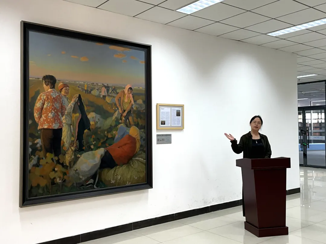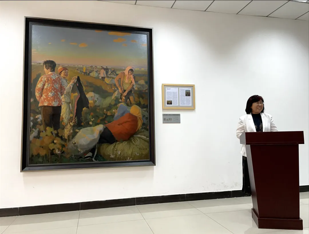 刘春龙对油画《彩云归》进行了介绍,这幅作品是他2020年国家艺术基金美术创作资助项目的重要成果,作品表现了沧州地区京杭运河两岸农民收棉花的劳动场景,以现实主义笔法描绘了劳动者丰收的喜悦画面,表达了对劳动者的赞美。作品在近景、中景、远景等方面做了精心布局。尤其近景对劳动者容貌的表现,反映出新时代农民劳动者的精、气、神,体现了社会主义新农村的新气象。整幅作品充分体现人与自然、人与动物、人与人之间的和谐统一。