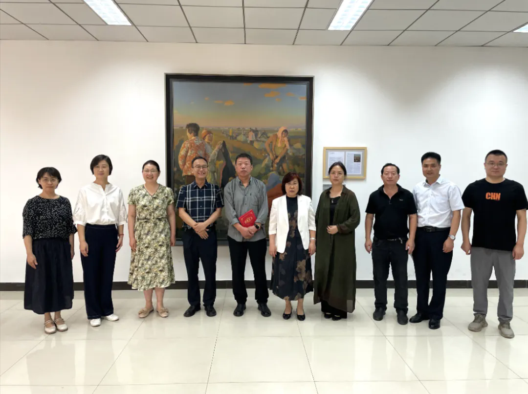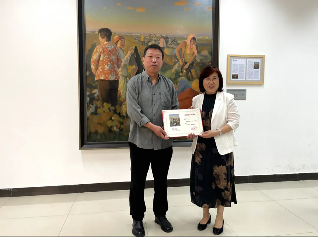程瑞芳代表学校为捐赠者颁发了捐赠证书。仪式结束后,与会嘉宾进行了合影,并纷纷驻足欣赏油画《彩云归》。